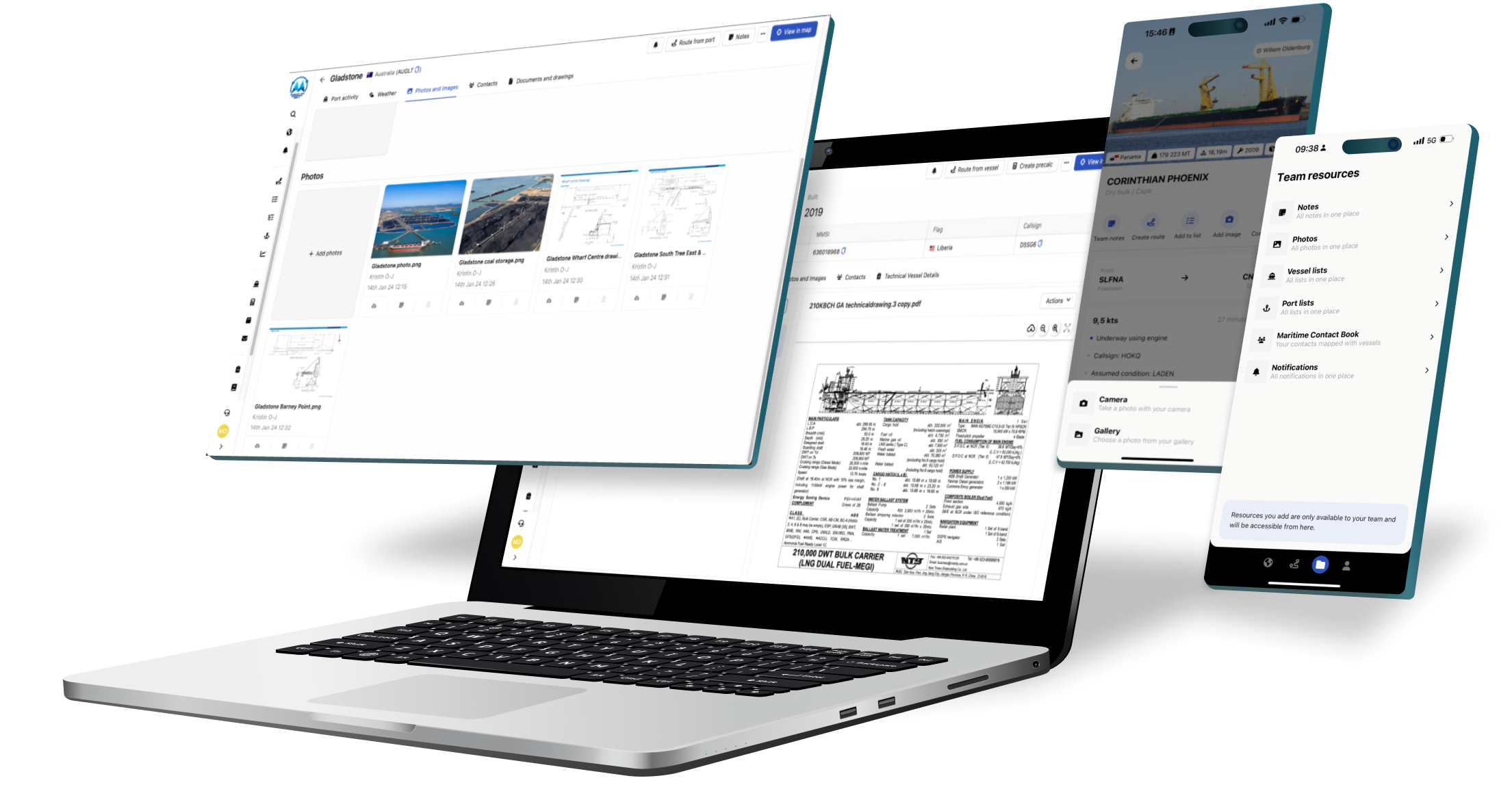Maritime Optima’s maritime software solution; ShipIntel, displayed on both desktop and mobile devices. The image shows ship routes, ports, and vessel information, highlighting sea between Europe, Africa, Asia, and Australia, as well as icons indication vessels on the map. The image on the mobile device, shows a sea route calculation made in ShipIntel for a dry bulk vessel. vessel  The software solution made by Maritime Optima, called ShipIntel, includes features like AIS data, voyage and sea routes, and consumption statistics, offering a comprehensive maritime management view for maritime operations, providing its users with maritime intelligence at their fingertips.