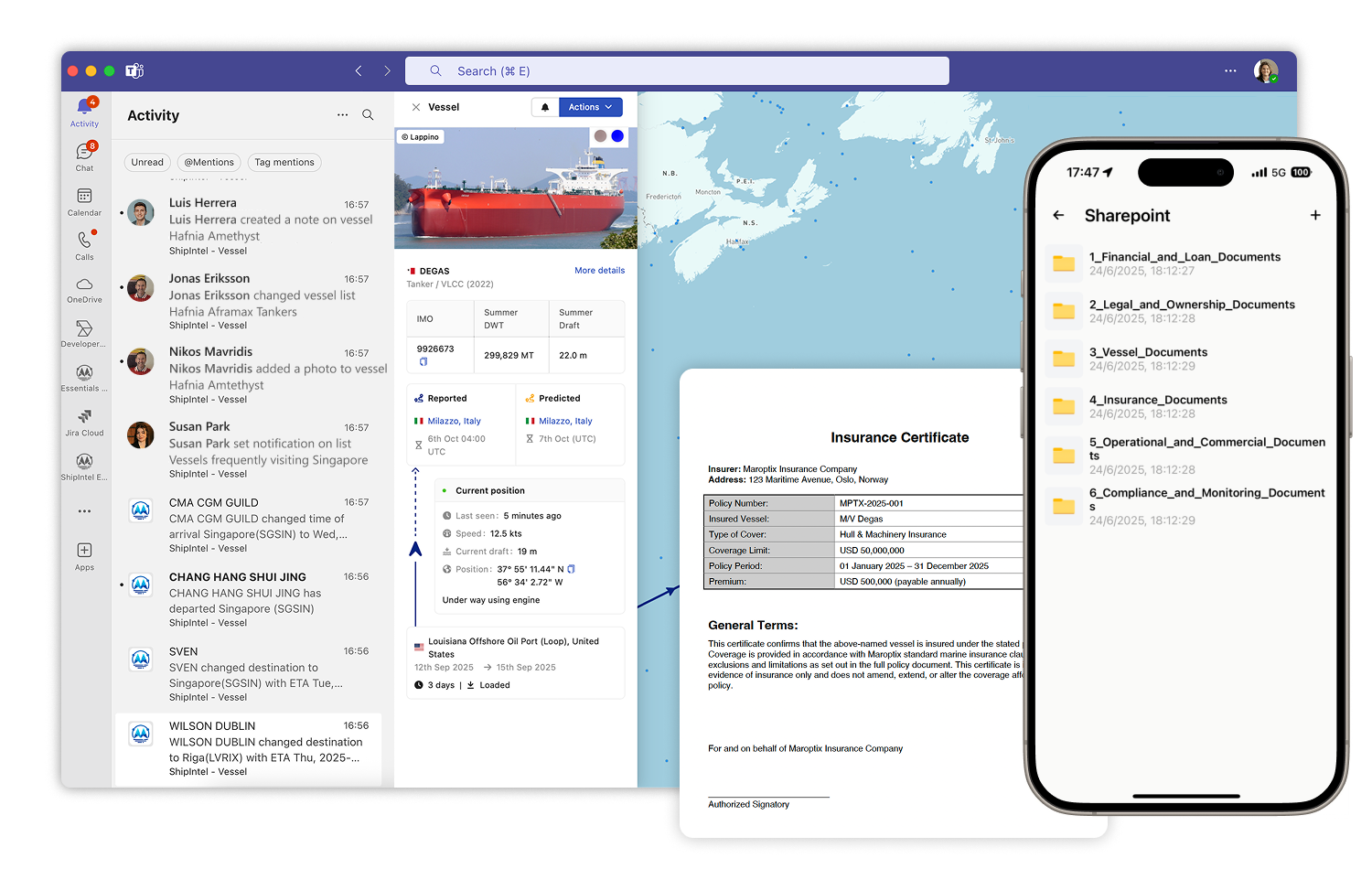 Add and share notes attached to vessels and ports in ShipIntel integrated in Microsoft Teams.