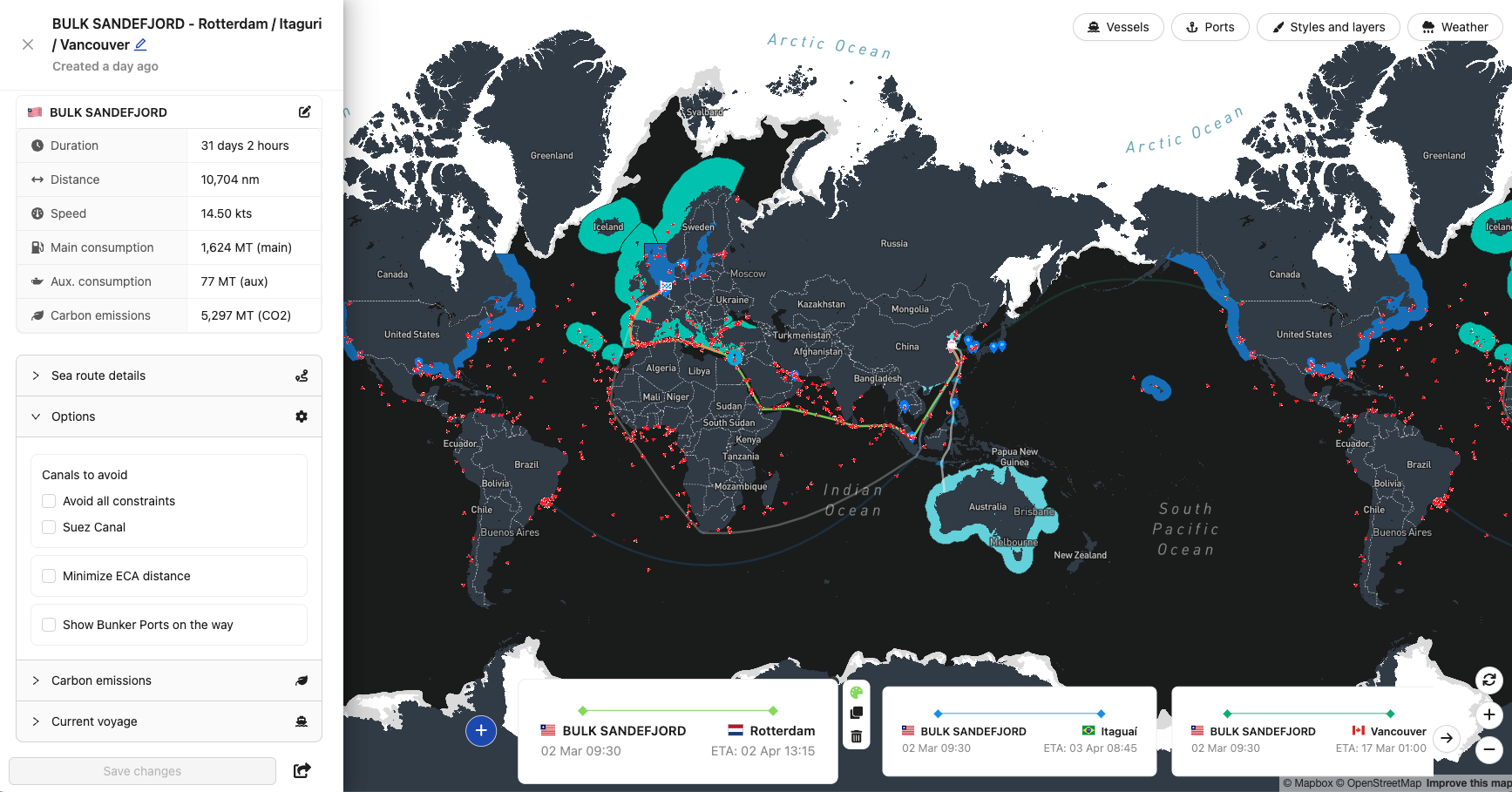 Yes! In ShipIntel you will always get the shortest sea route from a vessel's live AIS position to a port or if you create a sea route from a port to a port. We also show you alternative sea routes so you can select the one you prefer. For all sea routes you will find fuel consumption and carbon emissions. If the vessel is too large to pass a canal or straits, you will get an alert in the map.