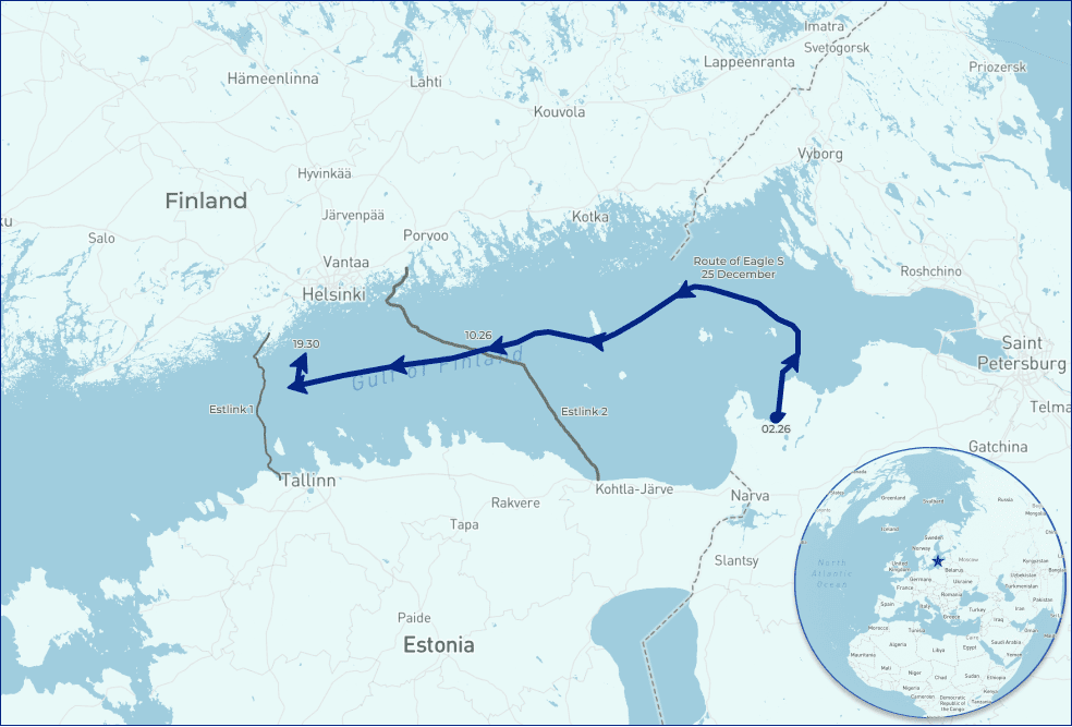 An illustration by Maritime Optima showing the route of "Eagle S" on December 25 / Time Zone: GMT / Graphics: Line Omholt-Jensen / Screenshot: ShipAtlas