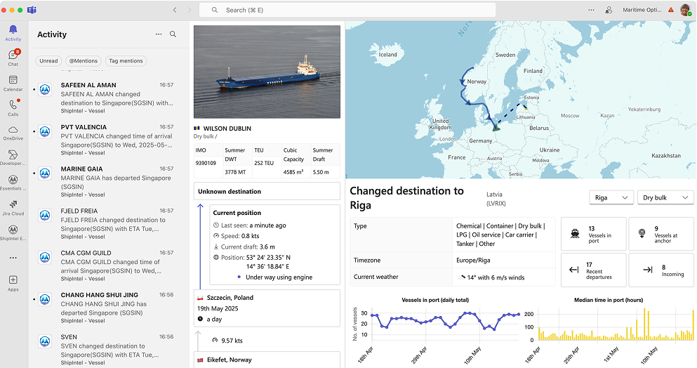 Get notified in Teams about vessel movements, port traffic, status changes, and team activity.