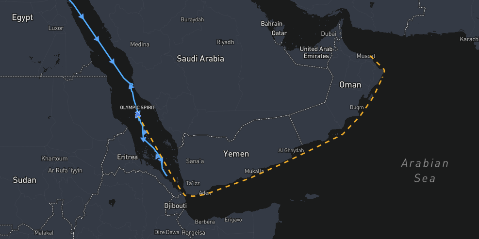 A Liberia-flagged tanker, Olympic Spirit (IMO: 9327097), came under attack in the Red Sea on Thursday. The attack has been claimed by Houthi militants. The incident occurred approximately 73 nautical miles southwest of Yemen’s port of Hodeidah (LOCODE: YEHOD), while the vessel was en route from Jeddah, Saudi Arabia, to Muscat, Oman.