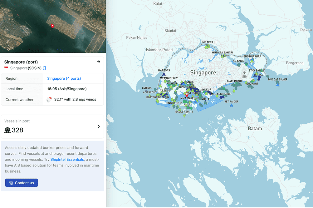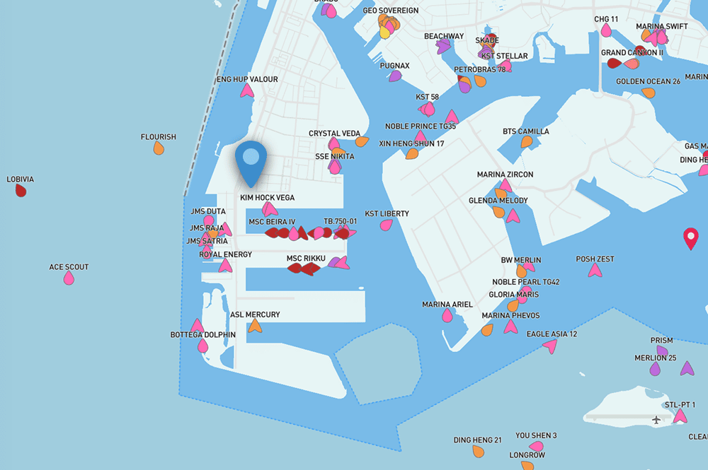 The port of Singapore has a total of seven terminals including Tuas, Tanjong Pagar, Keppel, Brani, Pasir Panjang, Sembawang and Jurong / Screenshot: ShipAtlas by Maritime Optima