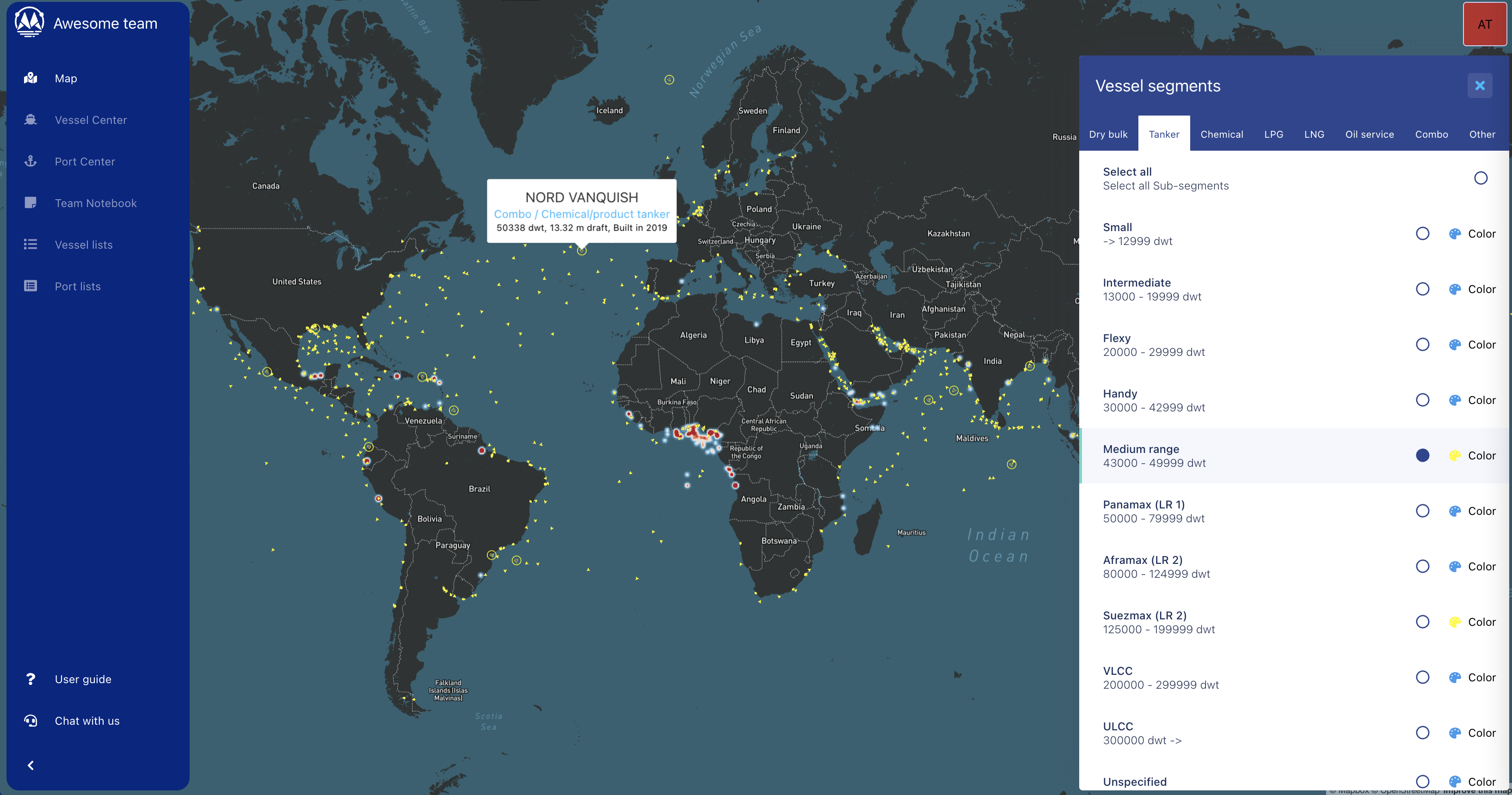 If you are working with MR tanker vessels you can add the "MR tanker sub-segment" to your map and create and add lists of your vessels. If you hover over the vessels, you will find information about their positions, last time we have observed them, where they are heading and technical information.