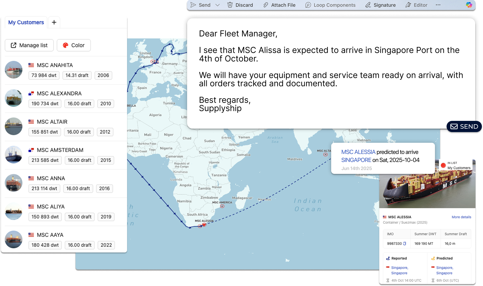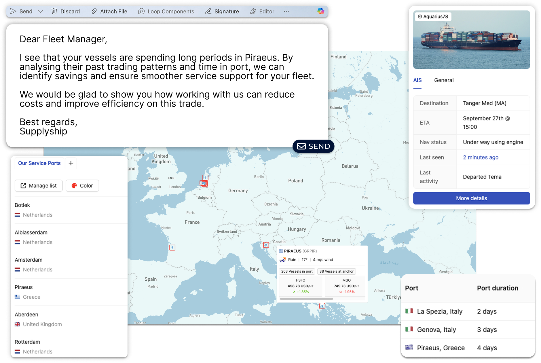 With your internal notes, files, and photos attached to vessels and ports, you can reach out at the right moment with proposals tailored to each potential client.