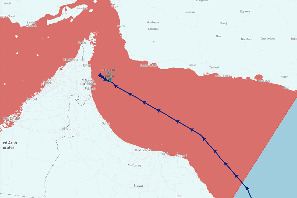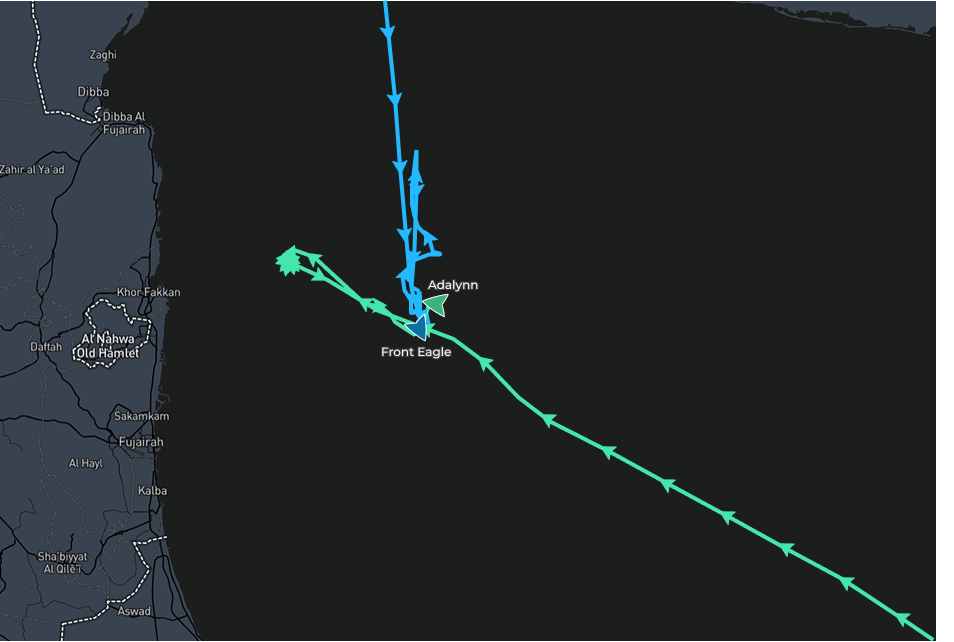 Not far from the central Strait of Hormuz, the vessels Adalynn (IMO: 9231767) and Front Eagle (IMO: 9855343) have collided. All crew members are reported to be safe and unharmed. No environmental contamination have been reported either.